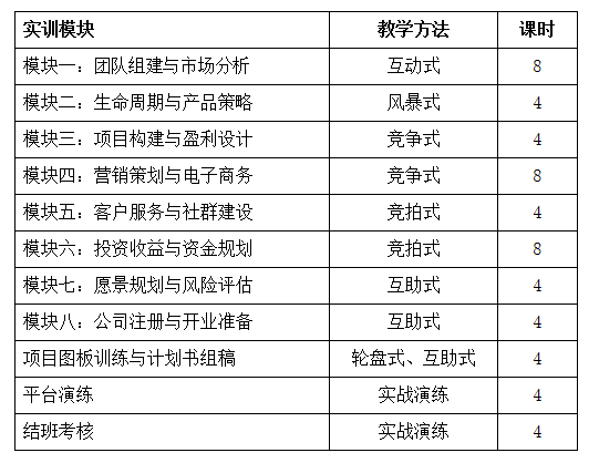 根据推动创新创业教育的有关精神和公司的创新创业教育计划,公司将联合杭州市人力资源与社会保障局和正保教育,开设《“8+X”模拟公司创业实训》第二课堂实训学习项目,培训共分为14次课,56学时,折合第二课堂2.5学分,计入培养方案的第二课堂模块。培训内容上主要覆盖了创业者在创业过程中需要了解和掌握的创业调研、项目选择、经营管理、市场营销和企业开办等相关内容,由于本项目受杭州市人力资源与社会保障局资助,实训考核合格由杭州市职业技能指导中心颁发《创业实训学员合格证书》和创业公司二课程修课证明。