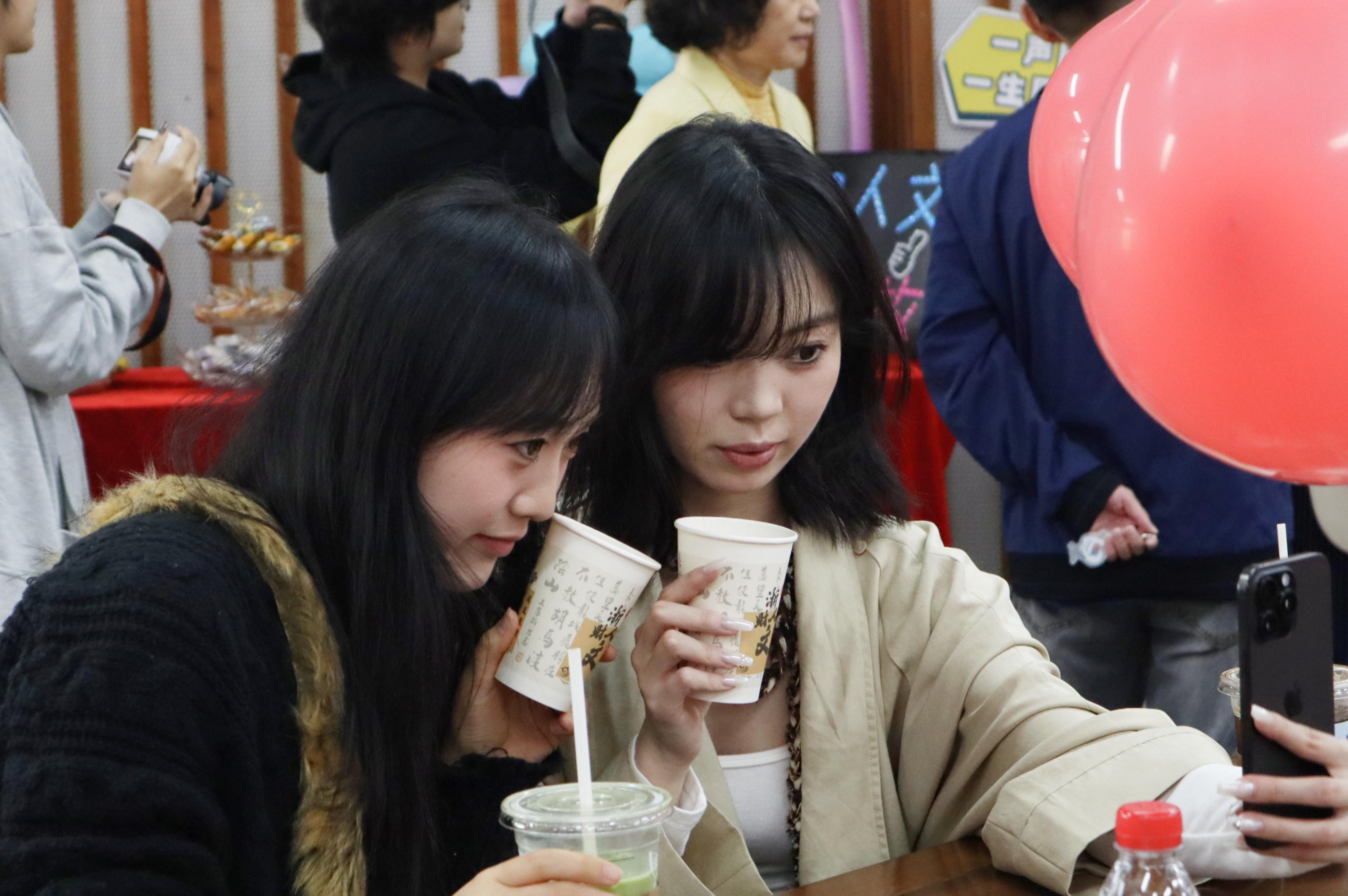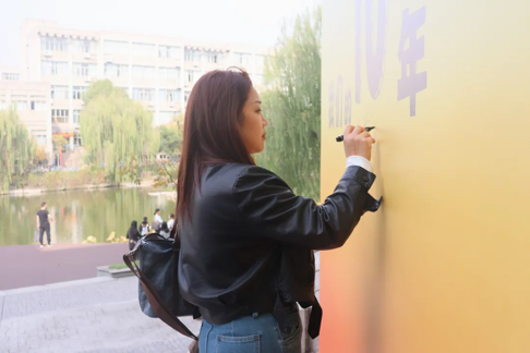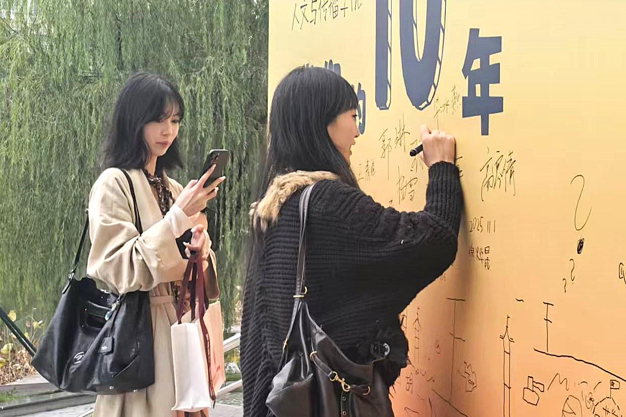 完成签到的员工,还会收到一份独特的人文纪念品,或是刻有公司印记的挂件,或是印有人文符号的明信片。再移步至长廊一侧,便是互动区。员工们执笔蘸彩,俯首书写下十年后的星辰与远方,墨迹在纸端游走,将此刻的心绪与期盼一一封存。