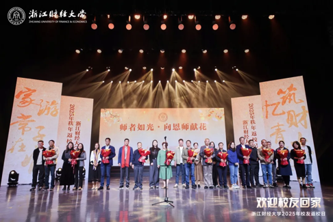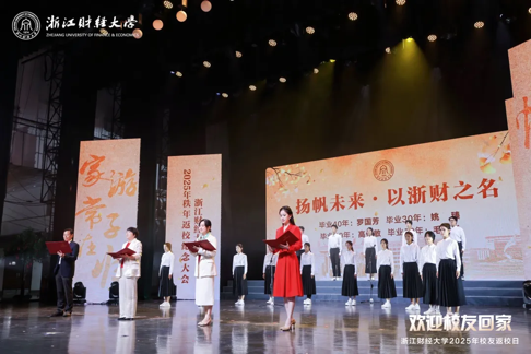 灯光渐柔,温情满场,诗朗诵《以浙财之名》此刻登场。公司2015级汉语言文学专业员工毛瑜华与18名员工代表并肩而立,每一个眼神都藏着对母校的热爱,当 “以浙财之名,承初心之诺,赴未来之约” 的誓言铿锵响起,我们听见了责任的重量。