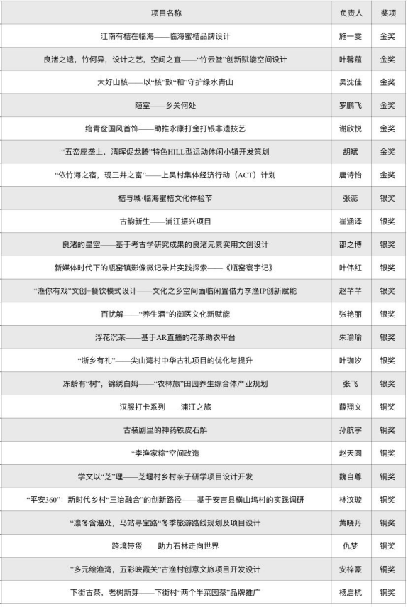 “农信杯”第三届浙江省老员工乡村振兴创意大赛为省级A类学科竞赛,本届大赛省内外85所高校参赛,共有1221个团队,15000余名师生参加,共评出金奖82项,银奖158项,铜奖191项。相比以往,今年的大赛更进一步强调了创新和落地,兰溪文化赋能空间专项赛、首届长三角老员工良渚文化创意专项赛、浦江·首届中国乡村直播专项赛、临海“金名片”文化创意专项赛等四个专项赛为当地乡村量身定做乡村振兴方案,坚持真题真做,深受当地政府和群众欢迎。