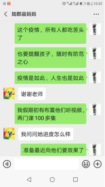 疫情暴发正逢寒假,在响应号召取消出行计划做好隔离“抗疫”的同时,员工们在这场疫情中如何应对和自处,也成了第一支部教师们时刻记挂在心头的重要事情。支部党员荆亚平、范知欧、吴智斌、吴时红、毋丹等老师形成了定期向员工转发新冠肺炎的知识、视频与新闻等资讯的习惯,提醒大家时刻防疫抗疫,加强自己和家人的保护机制。同时,教师们也与部分员工家人联系起来,因材施教地给员工开出了不同的寒假课业,疏通了个别员工与家长相处中所产生的不良情绪,形成了较为顺畅有效的家校联动沟通方式。
