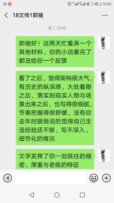 18文学的郭继同学是公司的“名人”员工,才气出众,写作、演讲、辩论、主持等样样出色,还有较为成熟、深入的研究能力,常常被任课教师们感叹是“十年一遇”的优秀员工。这个“寒假”出乎意料地超长,针对郭继同学的个人特色与能力,吴智斌老师与郭继同学家长联手给其开出了两个特色任务:一是根据其兴趣研读家乡宿迁知名作家鹿桥文集并选题完成专业论文一篇;二是推进其准备多时的长篇小说《洪流》的写作。到2月14日,郭继同学整理完成了小说13万余字的文稿,前五章计3万已经修改定稿,并与吴智斌老师、姚晓萍老师进行了较为细致、深入的讨论与修改。