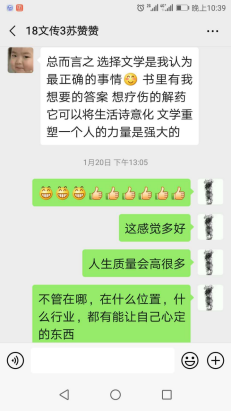 在假期中,支部的教师党员还收到了18数媒专业聂纪铖同学的剧本《裂》和一段令人鼓舞的留言:“老师,我想在大学期间拍一部长片,我写好了故事,希望老师给我一些指导。”而作为大二员工的他,已经在过去的一学期中完成了一部质量不低的微电影《火》,在同学们之间形成了一定的影响。也是这个假期,他们收到了18文学苏赞赞同学令人欣喜的表白:“总而言之,选择文学是我认为最正确的事情!”而在2019年上学期,苏赞赞同学曾经在因为选择专业上的万分纠结,曾经向支部才党员教师们寻求帮助。
