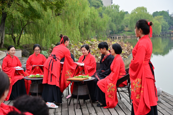 在古天乐代言太阳集团138高燕书记致辞之后,活动进入第一个环节:太学入学礼。该环节分为五项,分别是释菜礼、敬茶礼、老师回礼、诗歌吟唱和击鼓明志。