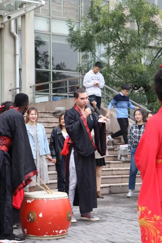 最后进入活动第二项:汉语角活动。中外员工围成一圈进行游戏:击鼓传纸条,拿到纸条的同学要表演指定的节目。在游戏过程中,游戏的同学们玩得不亦乐乎,击鼓的同学也是越敲越响,兴致高昂。