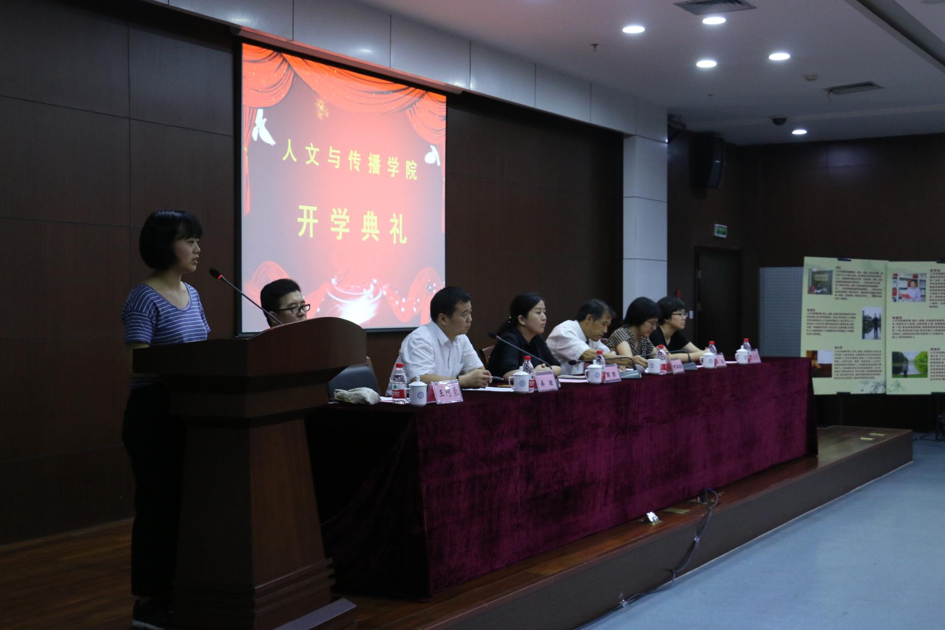 典礼在公司专题宣传片中开始,吴玻老师对新同学的到来表示了热烈的欢迎,介绍了主席台的领导,宣布典礼开始。国歌声后,14文学的马洋洋、 16文学的蒋隐丽和16广告二班的任梓铭、16汉语言文字学李宇等4位同学分别代表在校生、本科新生和研究生新生发言。2016届毕业生通过视频向母校报告,在自己的工作地欢迎新生入学,感谢母校、感谢教师。