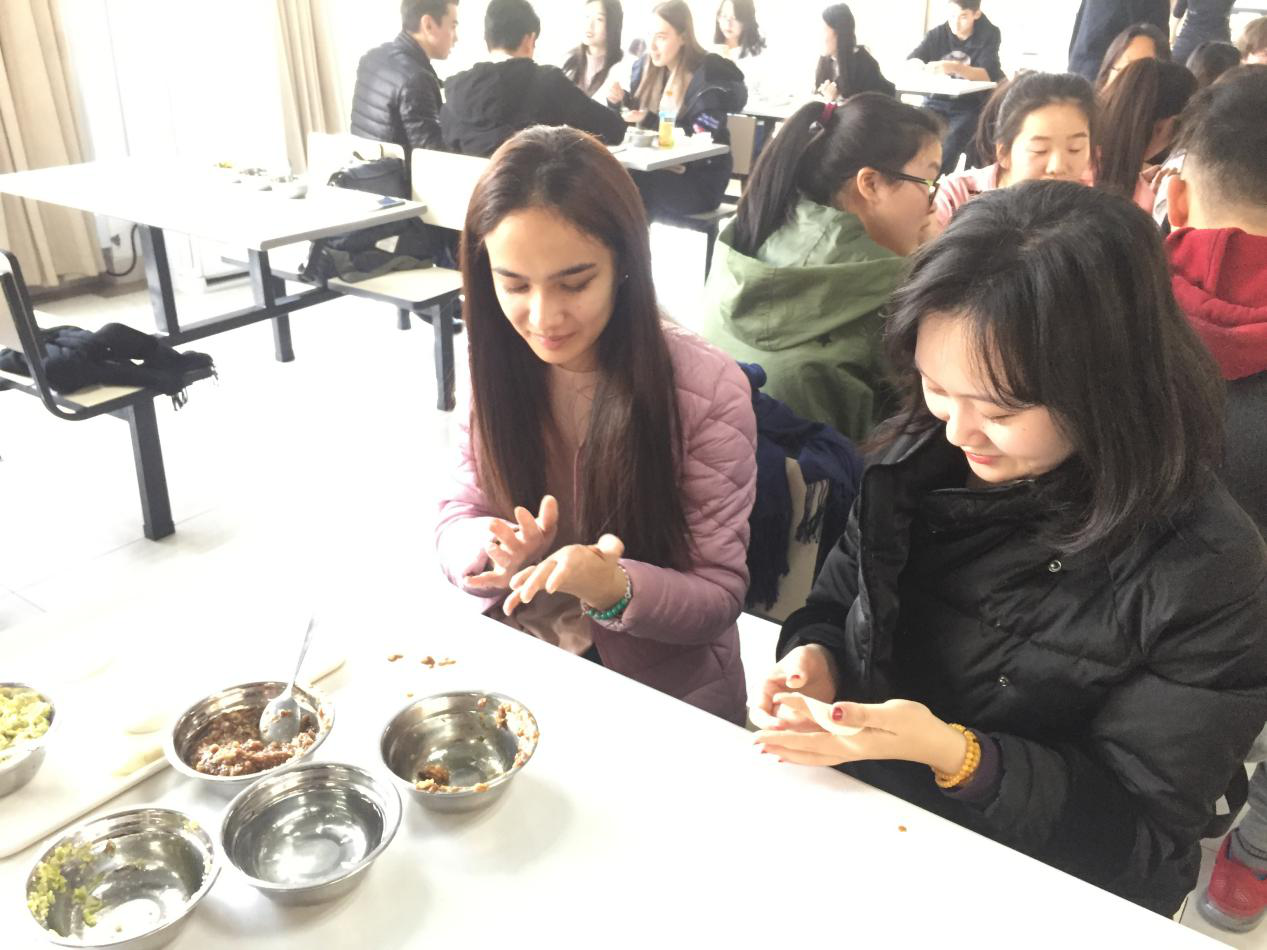 中外员工共同努力,很快就包出了一盘盘形态各异的饺子。来自哈萨克斯坦的同学包起了他们那形似元宝的饺子送给汉教同学;也有来自印尼的职工指导起中国同学,并告诉大家“我来中国一年半,最喜欢吃饺子了”。