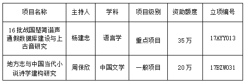 根据全国哲学社会科学规划办公室网站公布的消息,公司杨建忠教授申报的“16批战国楚简谐声通假数据库建设与上古音研究”和周保欣教授申报的“地方志与中国当代小说诗学建构研究”,获2017年度国家社科基金项目的立项。杨教授的项目为国家社科基金重点项目,是公司今年获得的两个重点项目之一,也是公司建院以来获得的最高级别的项目。周教授的项目为国家社科基金一般项目,这是继2006年度国家社科基金项目“伦理视野中的当代文学及其经验反思”之后,周教授主持的第二个国家级项目。 国家社科基金项目是我国哲学社会科学领域最高级别的项目,是衡量学者个人学术水平和公司学科综合发展水平的重要指标。至此,公司在研国家级科研项目已达16项。
