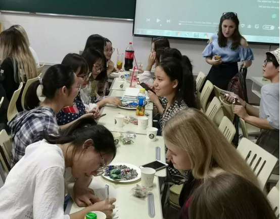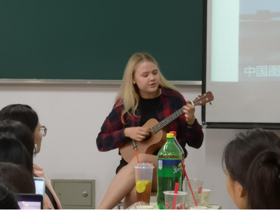 班会第二个阶段,是气氛热烈的中外员工联谊活动。国际公司兰浩老师带领一个由25位职工组成的新生班来到教室。联谊活动由刘亚辉老师和17汉语国际教育专业的职工李侠分别用汉语和俄语共同主持。中秋节的英文介绍视频、中国员工的女声小合唱《明月几时有》、职工的尤克里里奏唱、男女二重唱rap等节目都赢得了阵阵掌声,全班大合唱《喀秋莎》更是将气氛推向了高潮。