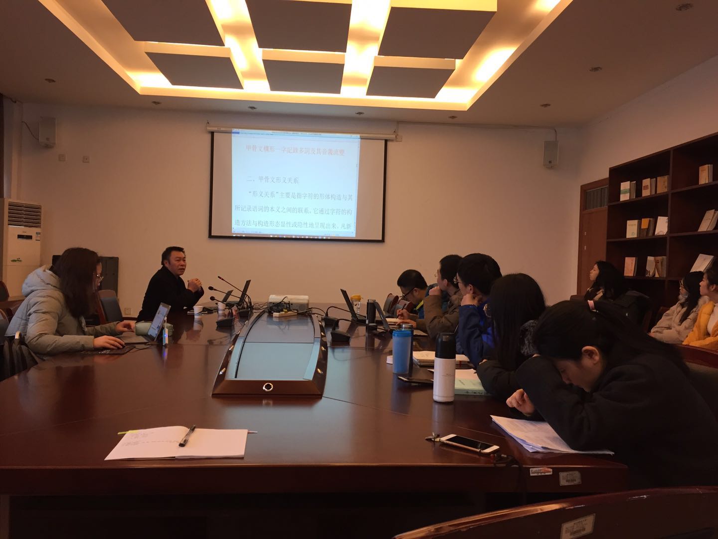 陈教授首先介绍了自己最新的研究成果,提出了独到的见解。然后,陈教授从详实的甲骨文材料出发,论证了甲骨文材料中存在的特殊文字现象,在场师生深受启发。