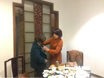 活动中,公司陈朝霞和洪艳老师还与女老师们分享了丝巾围法和护肤的技巧和心得。