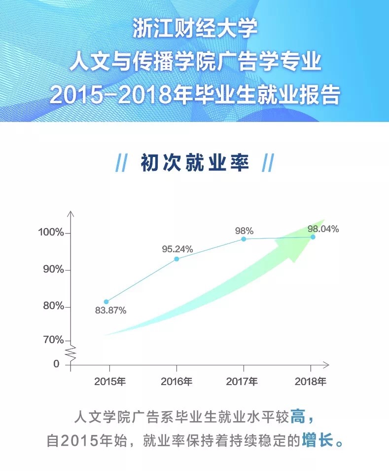 浙财广告学专业创立于2002年,至今已有17年的发展历史,专业教育扎实深厚,教学成果卓越。在2016年浙江省教育评估院的毕业生满意度调查中,公司广告学在专业满意度一项排名全校第一。