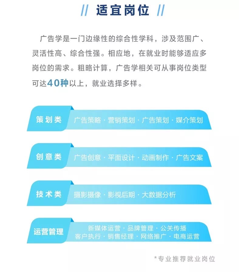 广告学是一门结合性的边缘科学,涉及社会学、经济学、心理学、新闻学、传播学、语言学、统计学、美学、声学、光学、电学等众多学科,广告学所培养的员工具备综合性素质,能够适应市场不同的人才需求。