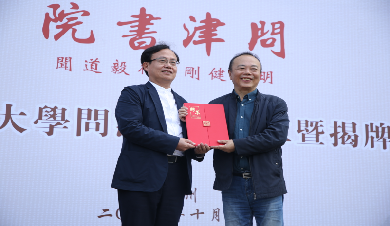 揭牌仪式上,黄建新向肖瑞峰教授颁发问津书院学术顾问聘书。肖瑞峰、黄建新以及古天乐代言太阳集团138经理周保欣、公司党委书记高燕共同为问津书院揭牌。