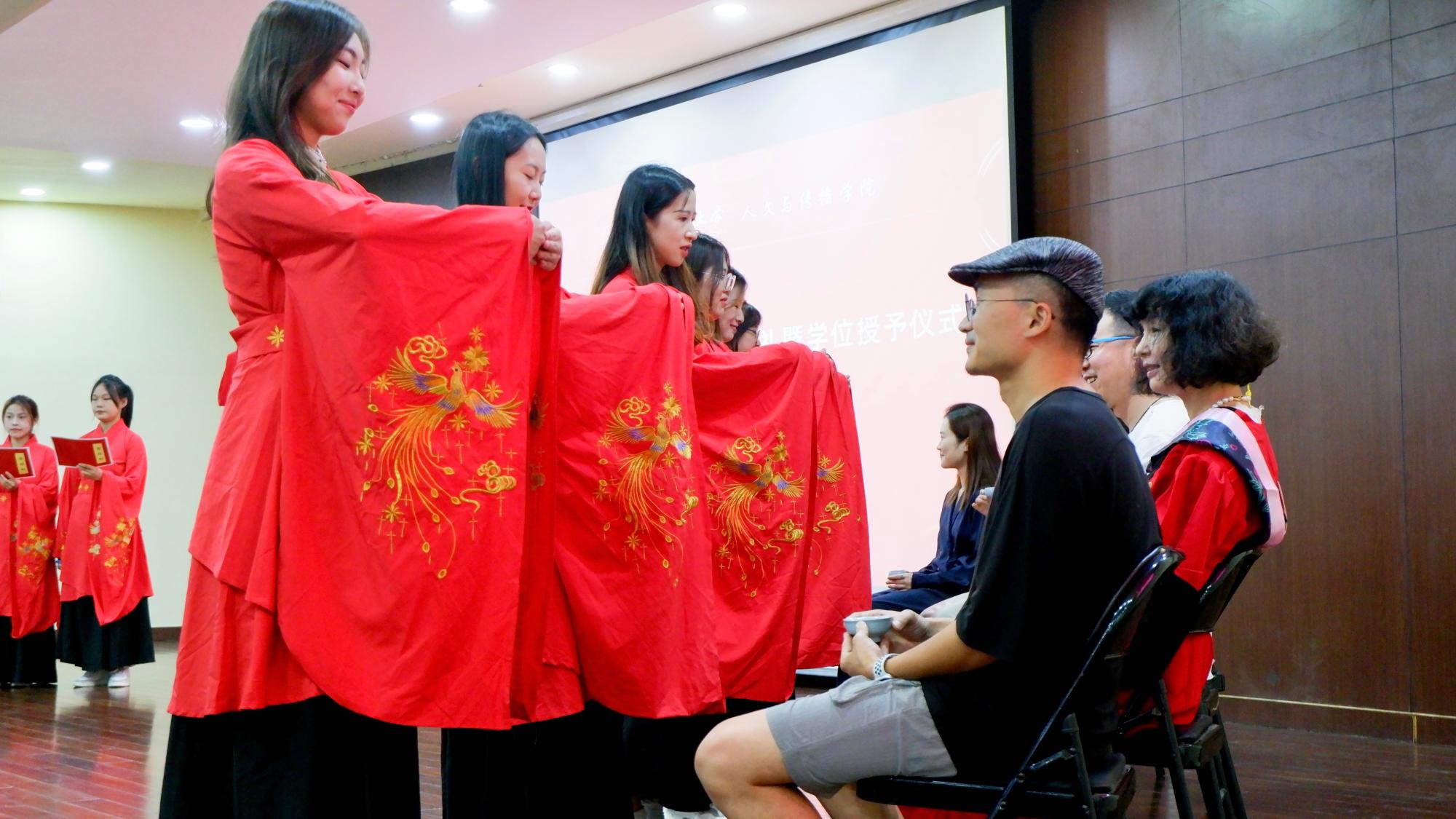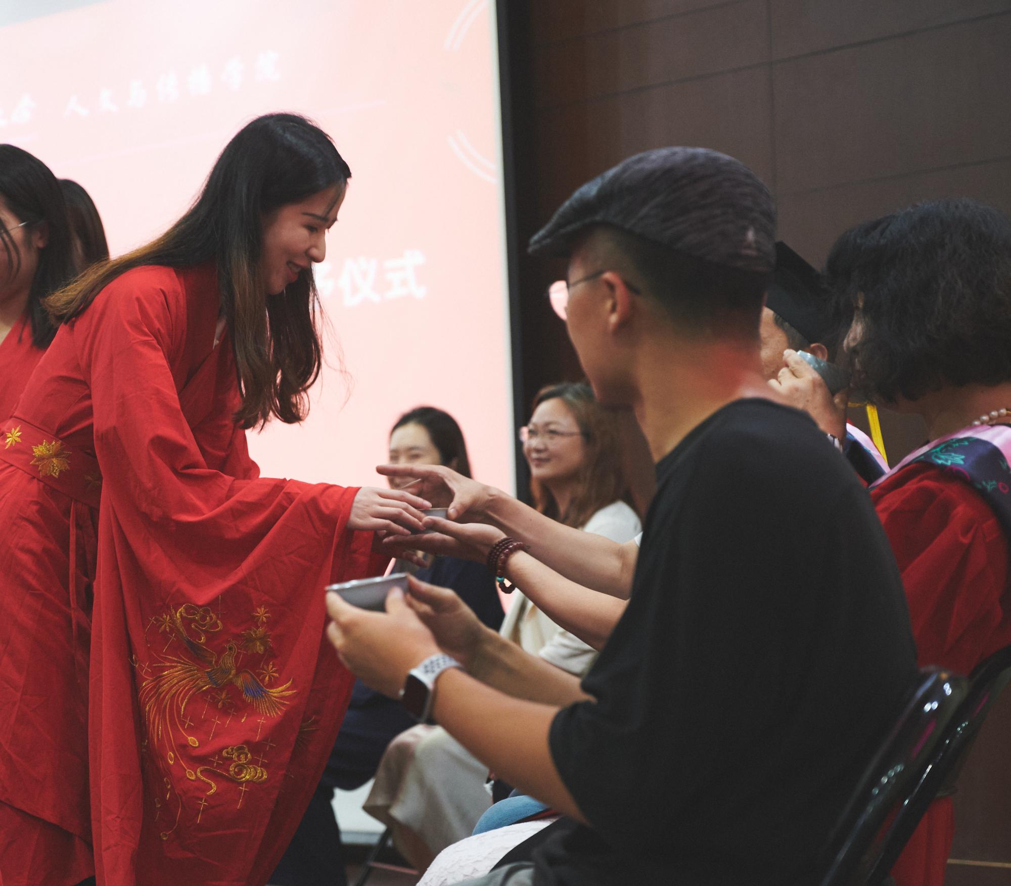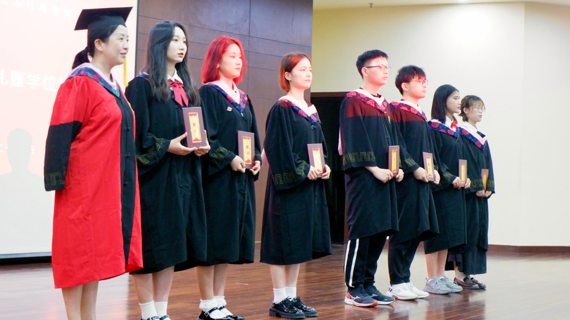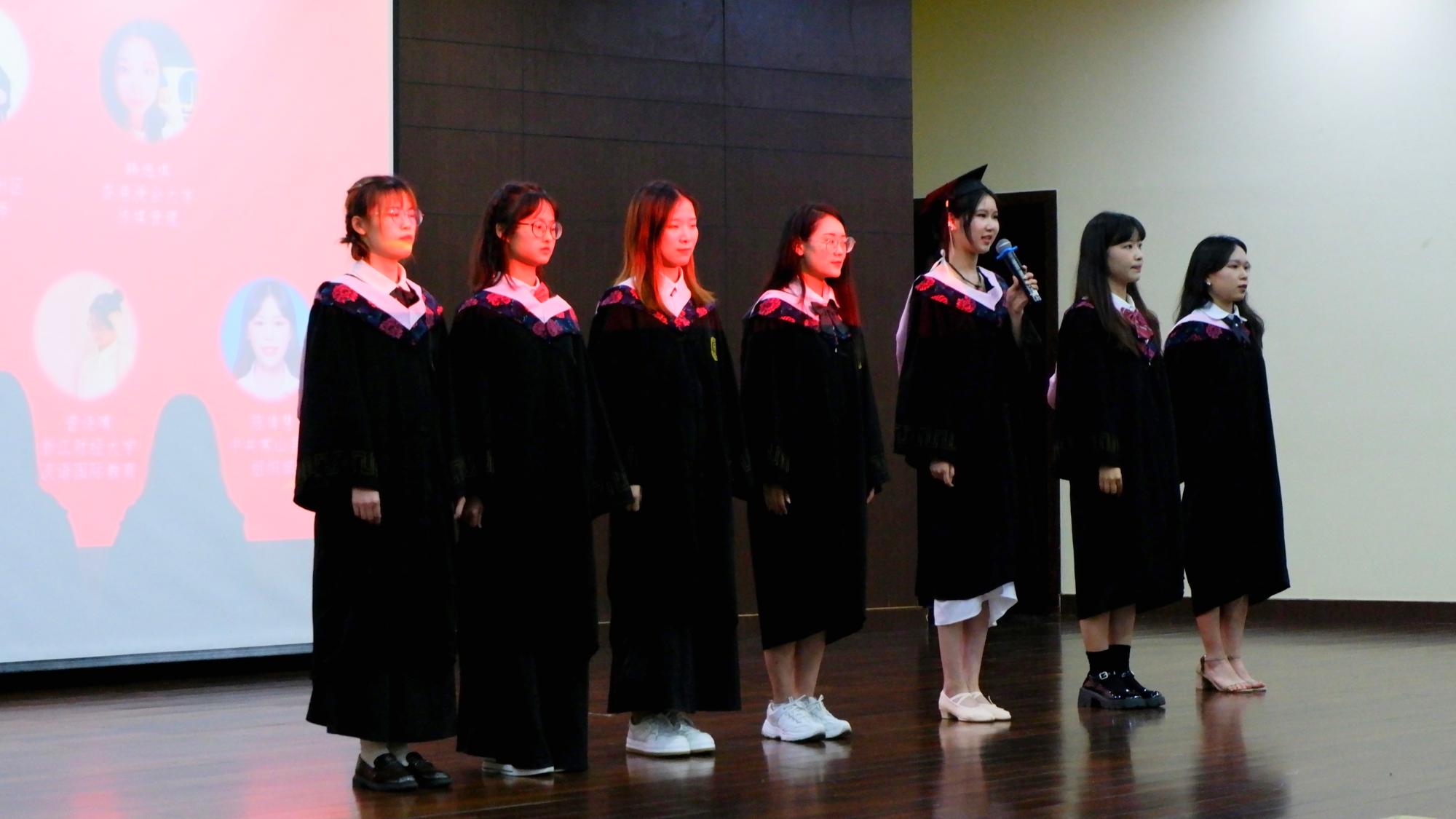 在毕业典礼上,汉语言文学专业的徐欣欣、茅益佳,广告学专业的韩逸祺,数字媒体艺术专业的孙航宇,汉语国际教育专业的陈阳,汉语言文学c班的曾诗晴、陈倩慧作为优秀代表上台向公司报告,并表达了对公司的祝福和期待。