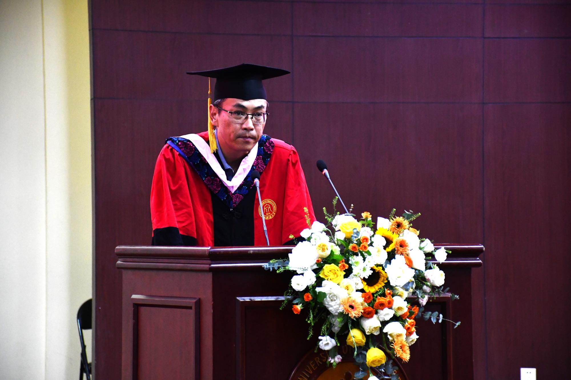 毕业典礼由经理周保欣教授深情的致辞开场。他首先祝福圆满完成学业的毕业生们毕业快乐。随后周经理提及了同学们最关心的就业难题,他鼓励那些对自己未来依旧迷茫的同学:“奥地利诗人里尔克说,‘没有什么胜利可言,挺住意味着一切’,而我要说的是,没有什么失败而言,挺住意味着一切!”在这个不确定的疫情时代下,周保欣经理希望每一位毕业生都能听从自己的内心,保持与父母、老师和朋友的沟通与协商,不害怕选择和困难,在勇气的选择和困难的克服中跨域人生道路上的障碍。最后,他以“祝你们好运!”深情地表达对同学们的嘱托与祝福。