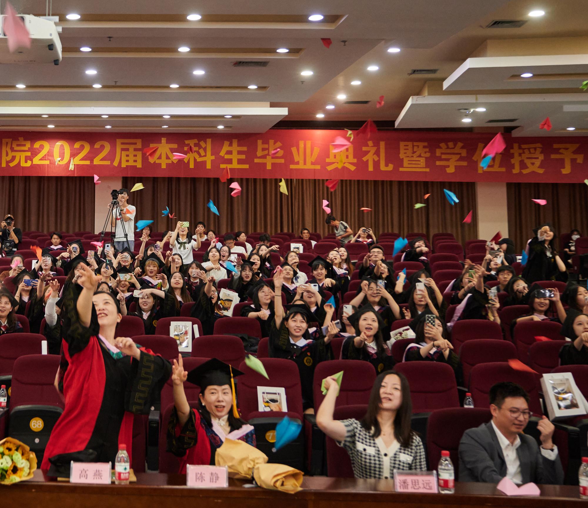 天下没有不散的宴席,与君相聚四年,终有一别。典礼的最后,在18数媒汤可菁和18广告刘颖同学的领唱下,全场大声合唱歌曲《光阴的故事》。所有毕业生起立,将手中的彩色纸飞机用力掷向远方,一只只纸飞机,象征着一个个梦想,愿每一个走出人文公司的毕业生都能飞得更高、飞得更远!