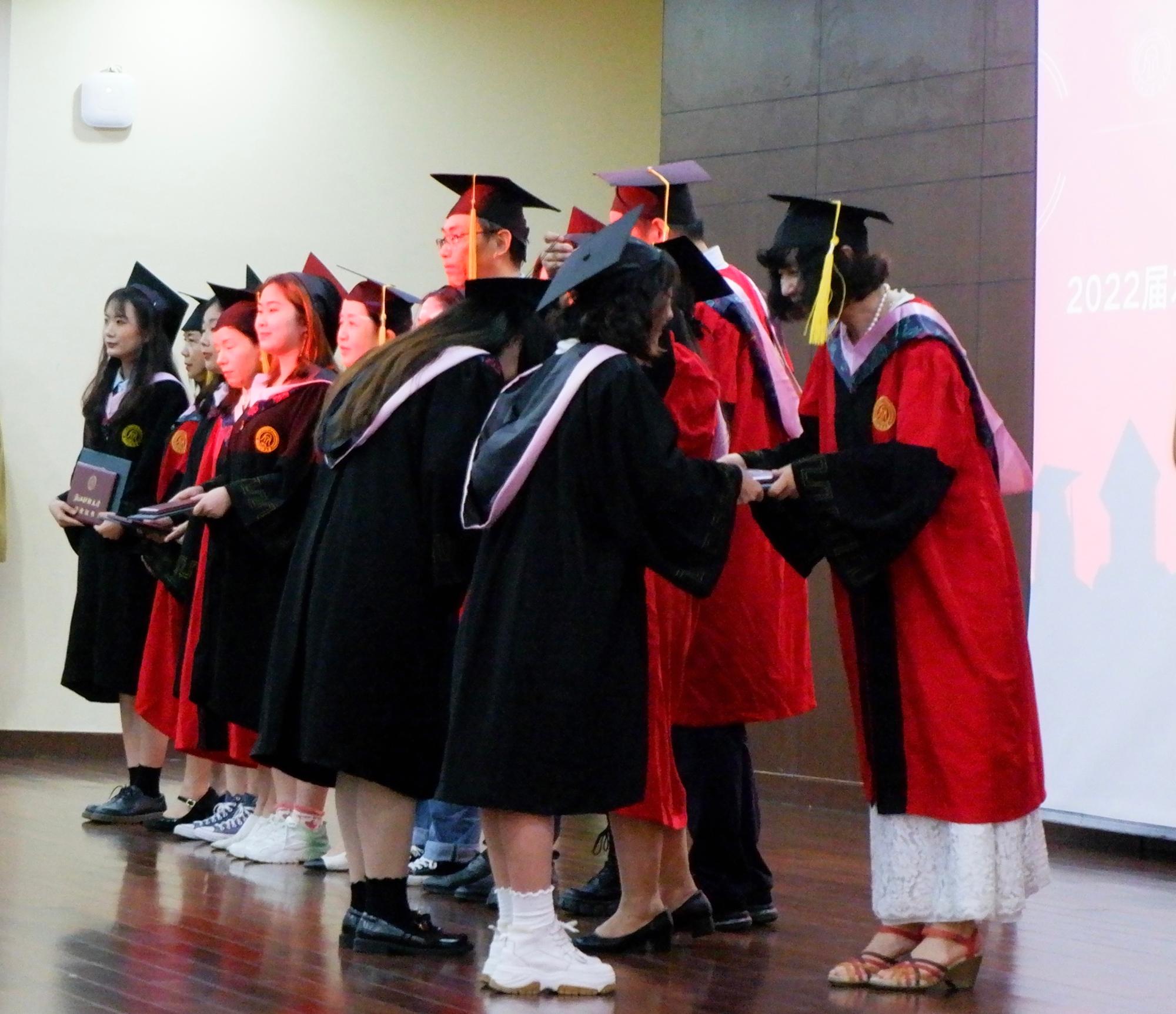 周保欣、高燕、陈静、吴智斌、赵顺宏、陈朝霞和洪艳七位导师身着导师服上台,毕业生以7人为一组,上台与导师们热情地握手拥抱,微微低头,让老师将其学士帽右侧的流苏拨至帽左。同学们接过导师们颁发的学位证书和毕业证书,扶苏拨穗、美好定格,公司用这种庄重的仪式感,为毕业学子们的老员工涯,画上一个圆满的句号。2022届毕业生的人生新征程,由此开启。愿有前程可奔赴,亦有青春可回首。