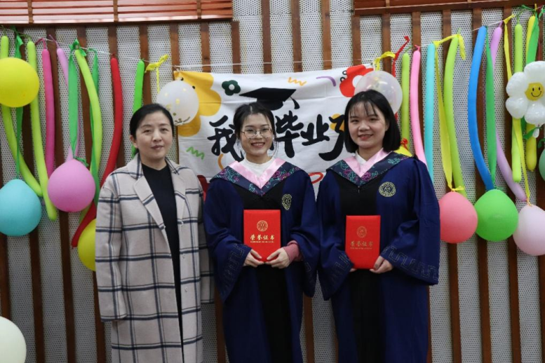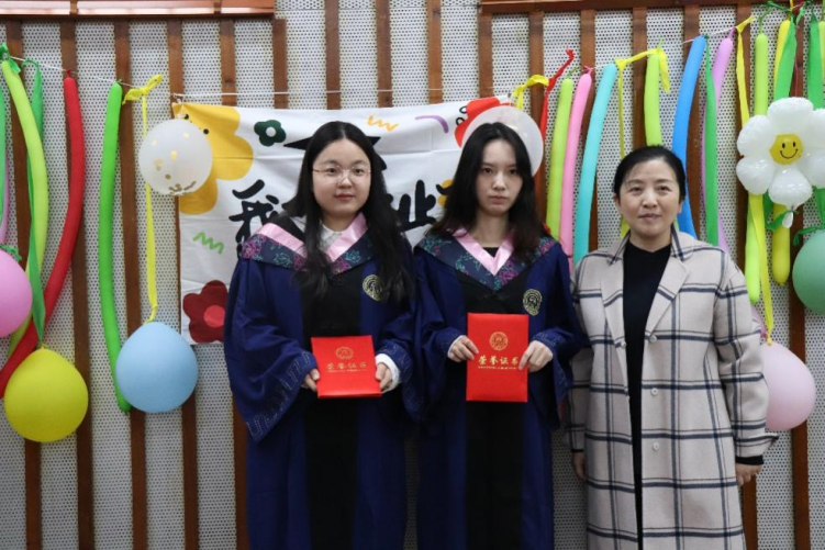 高书记为校级优秀毕业生郑泽霞、黄诗琴颁奖,为员工联络员倪飞跃、侯佳宁颁发聘书。