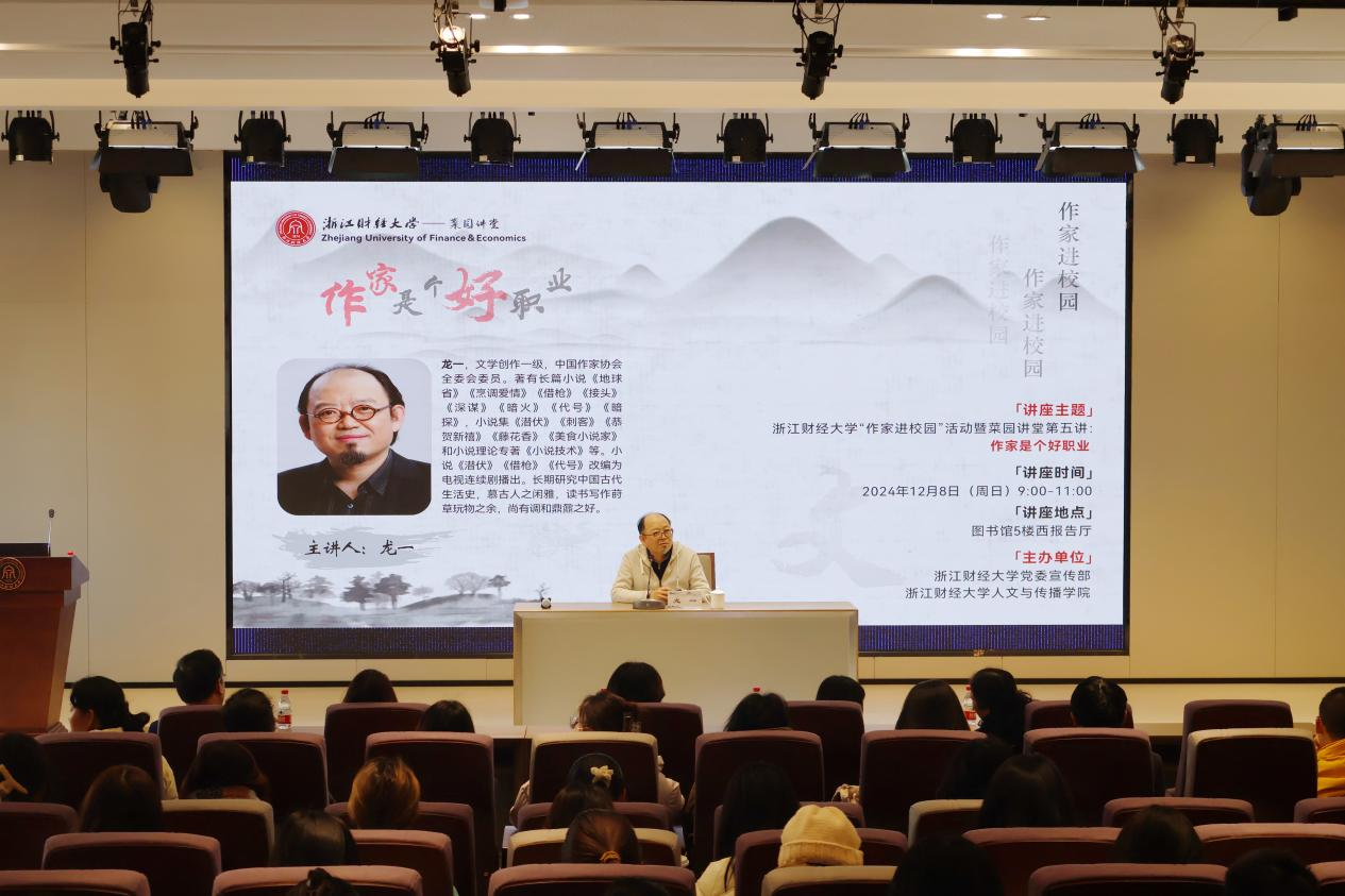 12月8日,“作家进校园”活动暨“菜园讲堂”第五讲在图书馆5楼西报告厅举行。著名作家、中国作家协会全委会委员龙一应邀作“作家是个好职业”专题讲座。党委宣传部、古天乐代言太阳集团138相关负责人、图书馆、外国语公司等在校师生代表180余人参加活动。