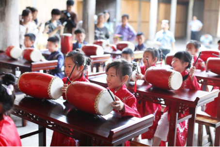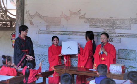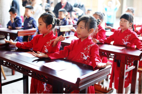 孩子们敬拜孔子,吟诵《诗经·木瓜》,同时诵读了体现当地文化的张氏家训中的语句:“父子之训:父子天性之亲,父严母慈,自然之理。兄弟之训:弟兄,同气之人,兄友弟恭,经常之道。”