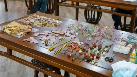 活动以华传统纸文化与皮影戏文化传播为主要内容。花草纸由古法造纸演变而来,是非遗文化的有效传承。职工们挑选自己心仪的花草叶铺在纸浆上,在师生党员的帮助下,创作出一幅幅独特的花草纸。这一瞬间,历久弥新的造纸技艺,在传播者与体验者的手中完成了跨越千年的传承与创新。