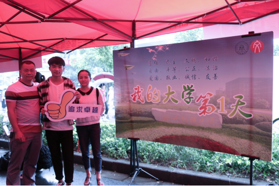 今年的迎新工作,公司提早规划、精心布置,公司员工会、2017级新生班助提前几天就在布置场地,策划活动,为新生准备具有意义的大学第一天。公司在报道现场布置了以“我的大学第一天”为背景的展板,并写上了社会主义核心价值观,制作了许多“不挂科”、“不旷课”、“自强不息、追求卓越”等标牌,供新生选择拍照留念。通过这种形式,让新生学习“社会主义核心价值观”,向公司承诺在以后的学习之中做到不旷课、不作弊、不挂科等,上好新生入学第一课。迎新现场还准备了具有中国传统文化特色的印章装饰置于报到处两侧柱子,彰显人文特色。迎新当天虽然下着雨,贴心的志愿者们还为新生及家长准备了一次性雨披以防有些前来报到的同学因为没有带伞而被淋湿。很多家长被这暖心之举所感动。