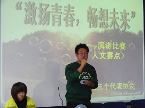 一点半,比赛准时开始,伴着舒缓的音乐,主持人娓娓道来关于青春的开场白,此次活动的主题,以及参赛纪律和评分细则。来自工商管理公司的邓玲玲第一个上场。她演讲的题目是《与青春有关的日子》。或许是因为第一个上场,她的表现略显紧张,但这并不影响同学们陶醉在她对青春诗意的感悟中。在她之后,其他选手陆续上场,比赛持续升温着。来自人文公司广告专业的韩雪峰同学作为四号选手表现惊艳。他从容不迫的上台、有条不紊的叙述、娓娓道来的演讲获得了在场人员由衷的喝彩。