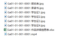 报送至公司的电子版文件,内容包括:作品文件以及报名表、承诺书、所有作者的员工证拍图、作品详细信息表(作品文件均以参赛编号命名,其他文件命名方式:参赛编号+报名表、参赛编号+承诺书、参赛编号+员工证1、参赛编号+员工证2、作品详细信息表,作品详细信息表格式见附件2) ,报名表和承诺书都需要电子签名,最后必须以zip或rar压缩包整理所有文件,文件命名为参赛编号,可参看下列图示举例: